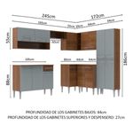Fabricado con elementos de calidad, tiene tiradores de aluminio, correderas y bisagras metálicas y patas regulables en PVC. También incluye una encimera en todos los Gabinetes Bajos y también es posible instalar una tarja de acero inoxidable o piedra, con medidas de 105 x 44 cm.