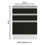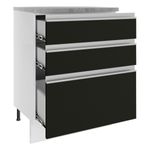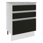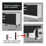 Cuenta con tres cajones grandes, siendo el último más profundo, con tiradores de aluminio y corredizas telescópicas que permiten la apertura total de los cajones. Dispone de patas de PVC con regulación de altura y zócalo removible en MDP de fácil encaje.