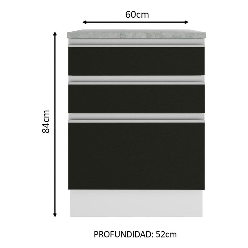 Un (1) mueble bajo de 84 cm de alto x 60 cm de ancho x 52 cm de profundidad, con tres (3) cajones y encimera con acabado Mood