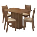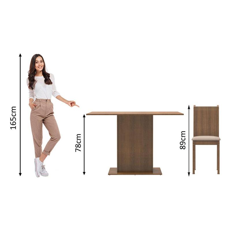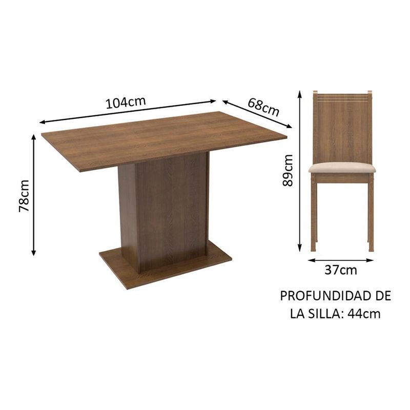 La mesa rectangular tiene capacidad para cuatro personas. El tono de la madera agrega belleza al producto y combina con los más variados ambientes. Muy prácticas, las sillas son de MDF y MDP, con respaldo pintado y asiento tapizado.