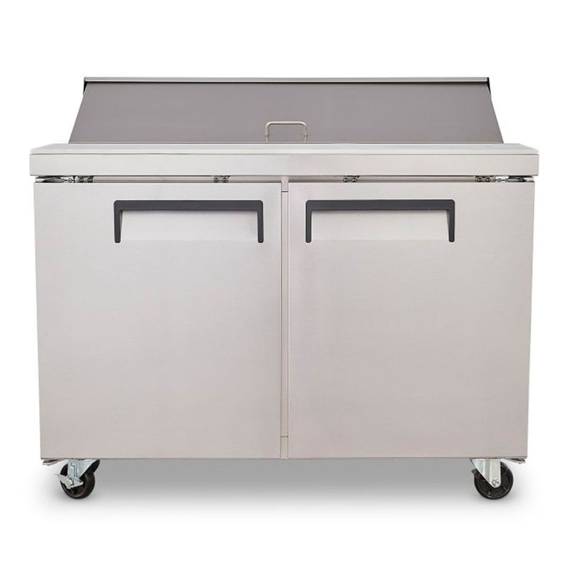 La mesa de preparación de alimentos de Torrey es de 48 pulgadas, construida en acero inoxidable para mayor durabilidad e higiene. Cuenta con insertos en la parte superior que facilitan el acceso a los distintos ingredientes para una rápida preparación. Tiene 2 puerta, 2 parrillas y 4 llantas para su fácil movilidad.